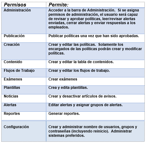 Otro permiso puede ser asignado a un usuario dándole la habilidad de crear y editar funciones específicas dentro DynamicPolicy™. Las siguientes funciones son suministradas para cada tipo de permiso.