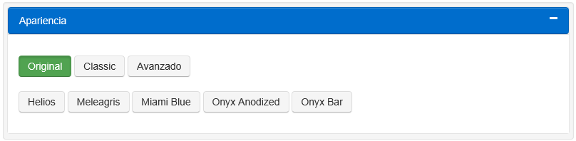 2.Debajo de Apariencia, seleccione Original, Classic, Helios, Meleagris, Miami Blue, Onyx Anodized, Onyx Bar o Avanzado. Si se selecciona Avanzado, una ventana de apariencia aparecerá permitiéndole editarla en un escenario HTML, en donde podrá modificarse la apariencia de la pantalla.