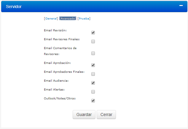 2.Seleccione las opciones que prefiera para enviar un email para Revisión, Aprobación y Audiencia. Puede seleccionarse una o más opciones para notificación. Estas opciones afectarán a todas las políticas.