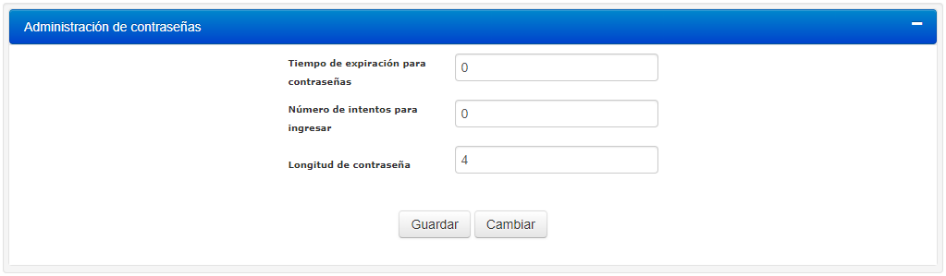 La administración de contraseñas permite aumentar la seguridad para las cuentas de usuarios por medio de los parámetros de escenarios regulados por el tamaño de la contraseña, expiración y limitaciones sobre intentos de accesos inválidos.