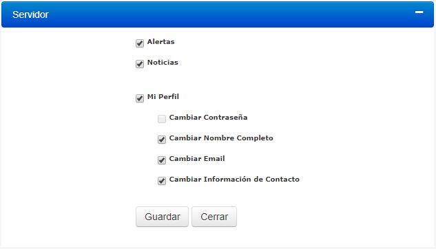 Es posible personalizar DynamicPolicy™ activando o desactivando los módulos de la aplicación (Alertas y Noticias) y funciones (Perfil de Usuario/Administración de Contraseñas) debajo de Configuración de Módulos.