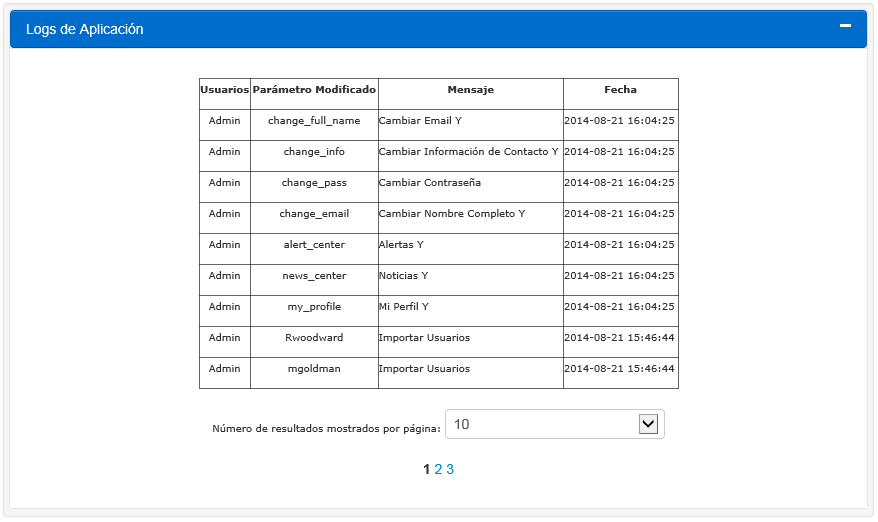 7.La página de resultados será desplegada, mostrando el nombre de usuario, los parámetros modificados, mensaje (descripción de transacción) y fecha/tiempo de la transacción: