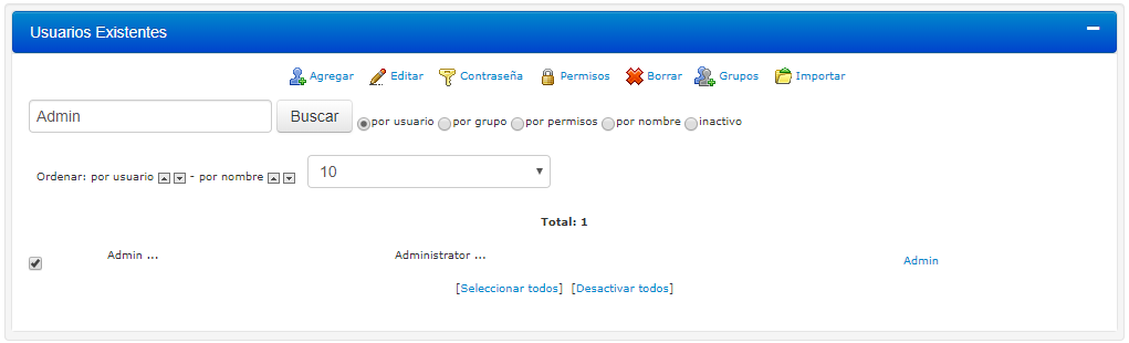 5.Haga clic en la casilla de verificación al lado del nombre de usuario Admin.