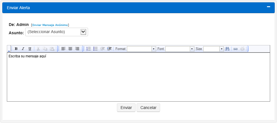 La pantalla de Alertas es donde los usuarios de DynamicPolicy™ y administradores pueden reportar problemas o comunicar comentarios sobre las políticas de un departamento específico, de todos los departamentos o de un usuario específico. Los usuarios o el departamento que recibe la alerta pueden responder al comunicado usando el centro de alertas (en la sección “Administrador”).