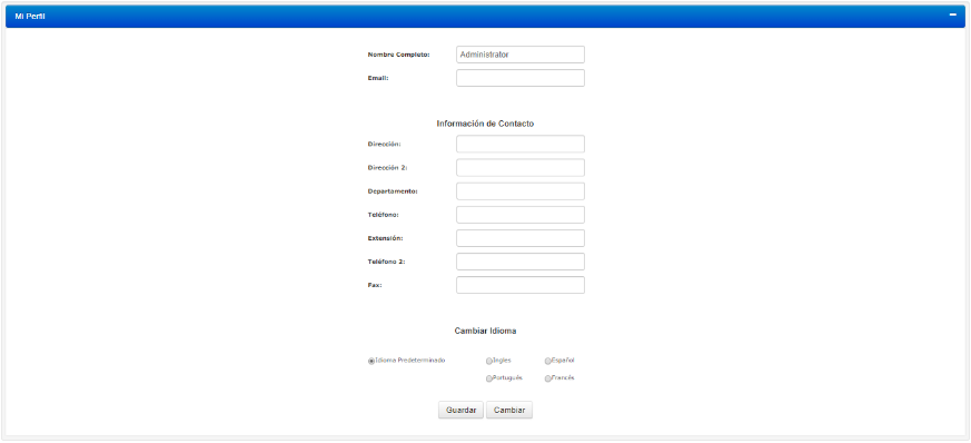 1.Haga clic en el nombre de su usuario al lado superior derecho de cualquier pantalla e ingrese al hipervínculo llamado Mi Perfil. Se desplegará la pantalla Mi Perfil: