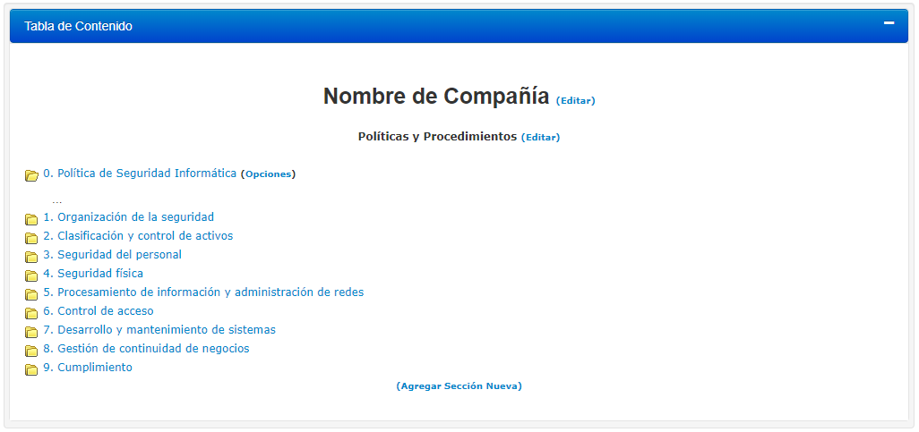 1.Desde el Menú de Contenido en la pantalla de Centro de Políticas, haga clic en Tabla de Contenido. La pantalla de Tabla de Contenido vigente se mostrará.