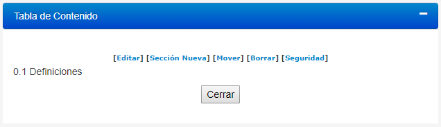 2.Presione el enlace de Opciones al lado del nombre de la sección. Las Opciones de Tabla de Contenido se desplegarán en el siguiente cuadro: