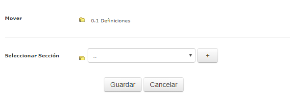 5.Seleccione Mover para mover la sección a otra ubicación en la Tabla de Contenido. Seleccione el título de la sección que desea mover, borrar o editar. Desde el menú desplegable, seleccione el nombre de la sección destino a la cual quiere ser movida. Use el botón de “+” para expandir la sección de destino si quiere posicionarse en un nivel inferior a la posición de la política. Guarde los cambios presionando el botón Guardar: