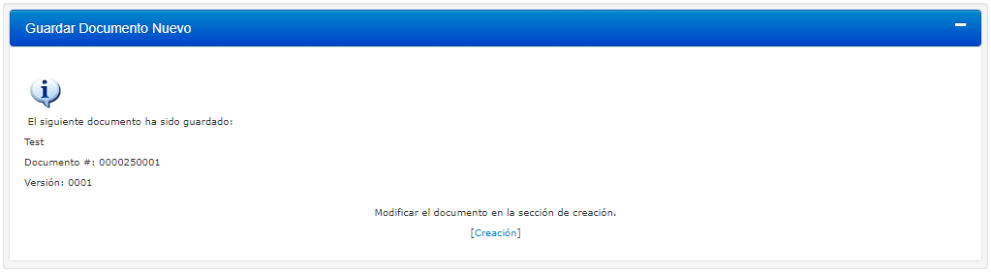 La pantalla del Nuevo documento salvado se desplegará confirmando que el documento ha sido creado y proveerá el nombre del documento, el ID y la versión: