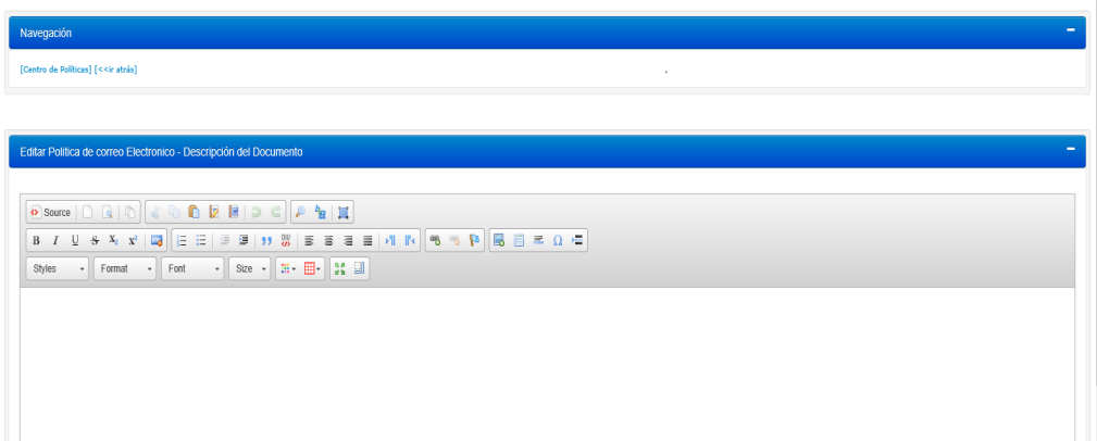 4.En el campo de texto, ingrese información de la nueva política o edite información de la política existente (si aplica). Use las funciones del procesador Word proveídas en la barra de herramientas para darle formato a su documento.