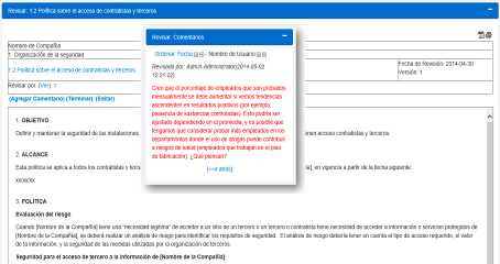 El administrador del sistema debería configurar los ID de los individuos que son responsables de la revisión de las políticas, brindándoles acceso al Centro de Políticas en la pestaña de Administración. Los revisores son normalmente individuos o grupos distintos al dueño o creador de la política. Los siguientes pasos aplican para individuos que revisan políticas: