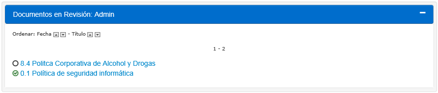 2.Presione Revisión, la pantalla de documentos en Revisión se desplegará con una lista de documentos. Si el cuadro al lado izquierdo del nombre del documento está en blanco, la revisión no se ha completado. Si está en color verde con un check marcado a la izquierda del nombre del documento, todos los revisores han completado su revisión: