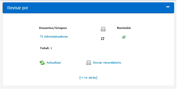 4.Para enviar un recordatorio a los revisores con el objetivo de recordarles tomar acciones, presione el vínculo Enviar Recordatorio. DynamicPolicy™ enviará un mensaje de correo electrónico a los revisores de las políticas.