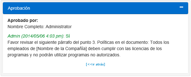 Las respuestas de aprobación serán desplegadas en la parte inferior de la pantalla de edición de la política hasta que el documento esté publicado. Las respuestas de los aprobadores son desplegadas en la parte de abajo del documento de la política con el nombre del aprobador, fecha y hora.