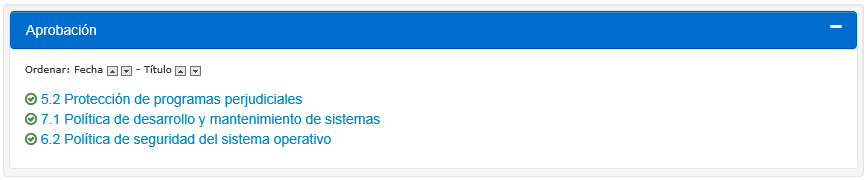 3.Ver los íconos al lado de cada nombre de política. Un check de color verde significa que la política ha sido aprobada por todos los aprobadores. Una “x” roja significa que la política no ha sido aprobada por todos. Un cuadro en blanco significa que no todos los aprobadores han proveído su decisión. Si la aplicación está configurada para no permitir publicación si la política no ha sido aprobada, el dueño es el responsable de resolver cualquier pendiente en el documento con los aprobadores.