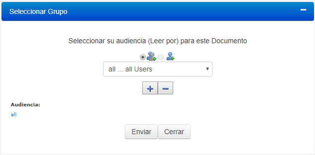 6.Agregue una nueva audiencia seleccionando un grupo de la lista desplegable presionando el botón ”+”. Para borrar un grupo de audiencia seleccione del menú desplegable el botón “-“.